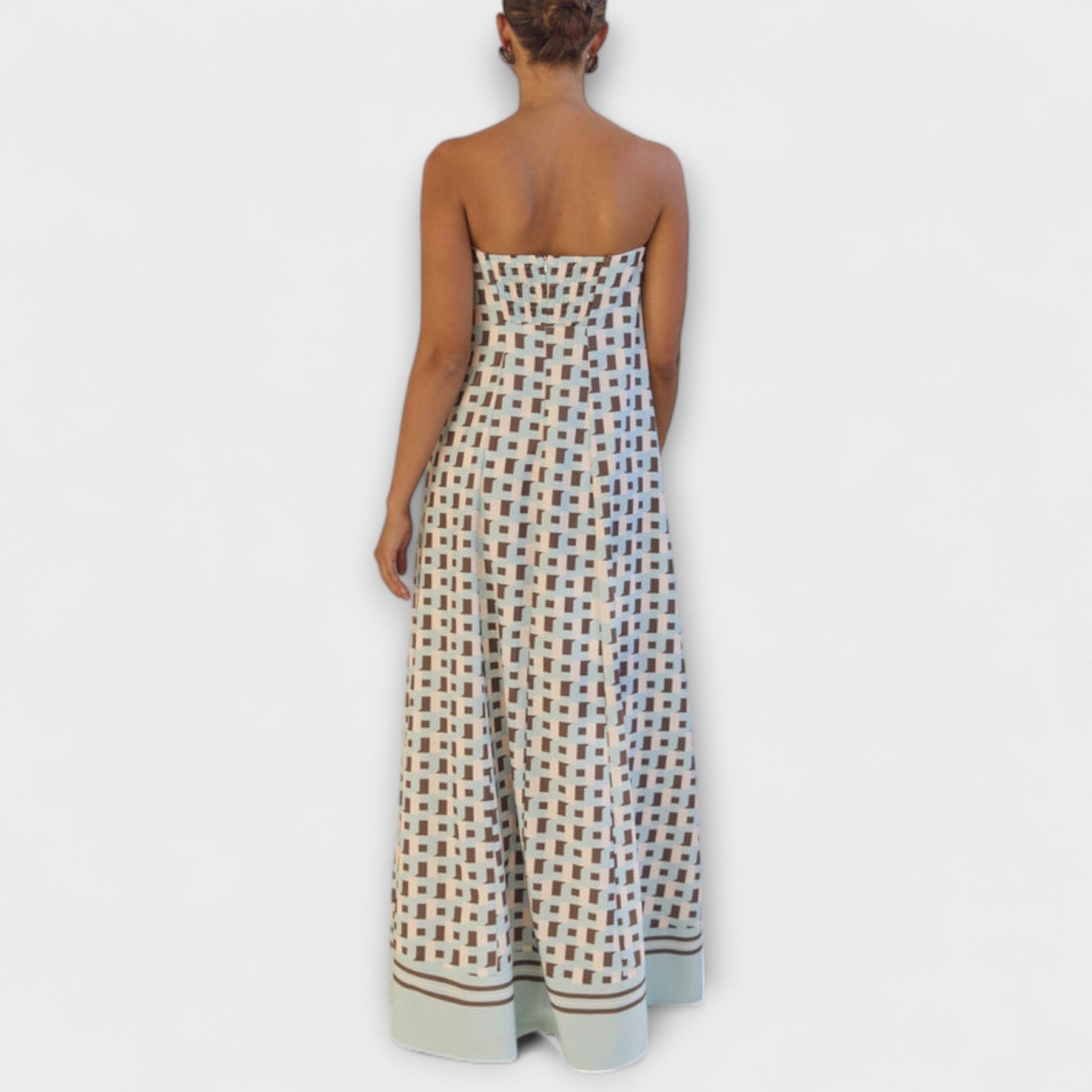 Bold, artistic, and effortlessly elegant, this off-shoulder maxi dress features an exclusive geometric print that draws attention. Perfect for any occasion, from summer soirées to stylish day trips, this dress is your go-to for sophisticated elegance.