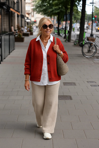 I was pleasantly surprised by how soft and cozy this cardigan feels. The fit is just right for me, and the sleeves are a nice length too. It has a relaxed look but still feels elegant enough to wear out. I’ve already had compliments on it!